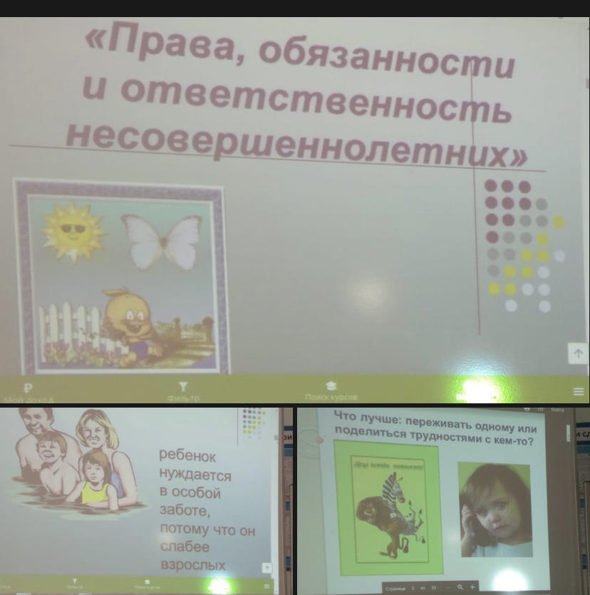 Во время классного часа были рассмотрены права детей, записанные в Конвенции о правах ребёнка и законодательных актах Российской Федерации и во Всеобщей декларации прав человека, обсуждали жизненные ситуации, в которые попадают знакомые ребятам сказочные и литературные герои, чьи права оказались нарушенными с точки зрения международного права. Во время классного часа учащиеся получили возможность ознакомиться с конкретными материалами: извлечения из Конституции Российской Федерации, Уголовно-процессуального Кодекса РФ, Кодекса об административных нарушениях, Семейного кодекса РФ, через всевозможные беседы, беседы-размышления, ситуативные практикумы, диспуты и т.д. Анализ извлечений из этих юридических документов, позволит учащимся не только узнать нормы международного и отечественного права в отношении несовершеннолетних, но и на практике убедиться в исполнении законодательства в настоящее время. Всё это призвано убедить учащихся в неминуемом наказании за проступки или преступления.