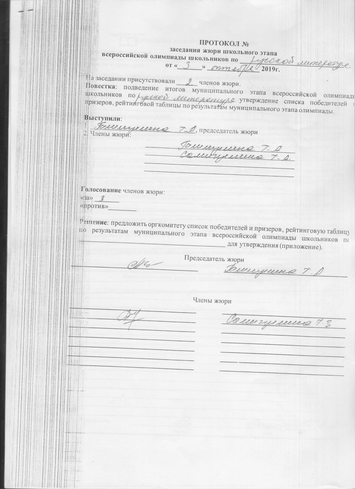 Протокол заседания жюри по Литературе. МБОУ СОШ с.Кипчак-Аскарово