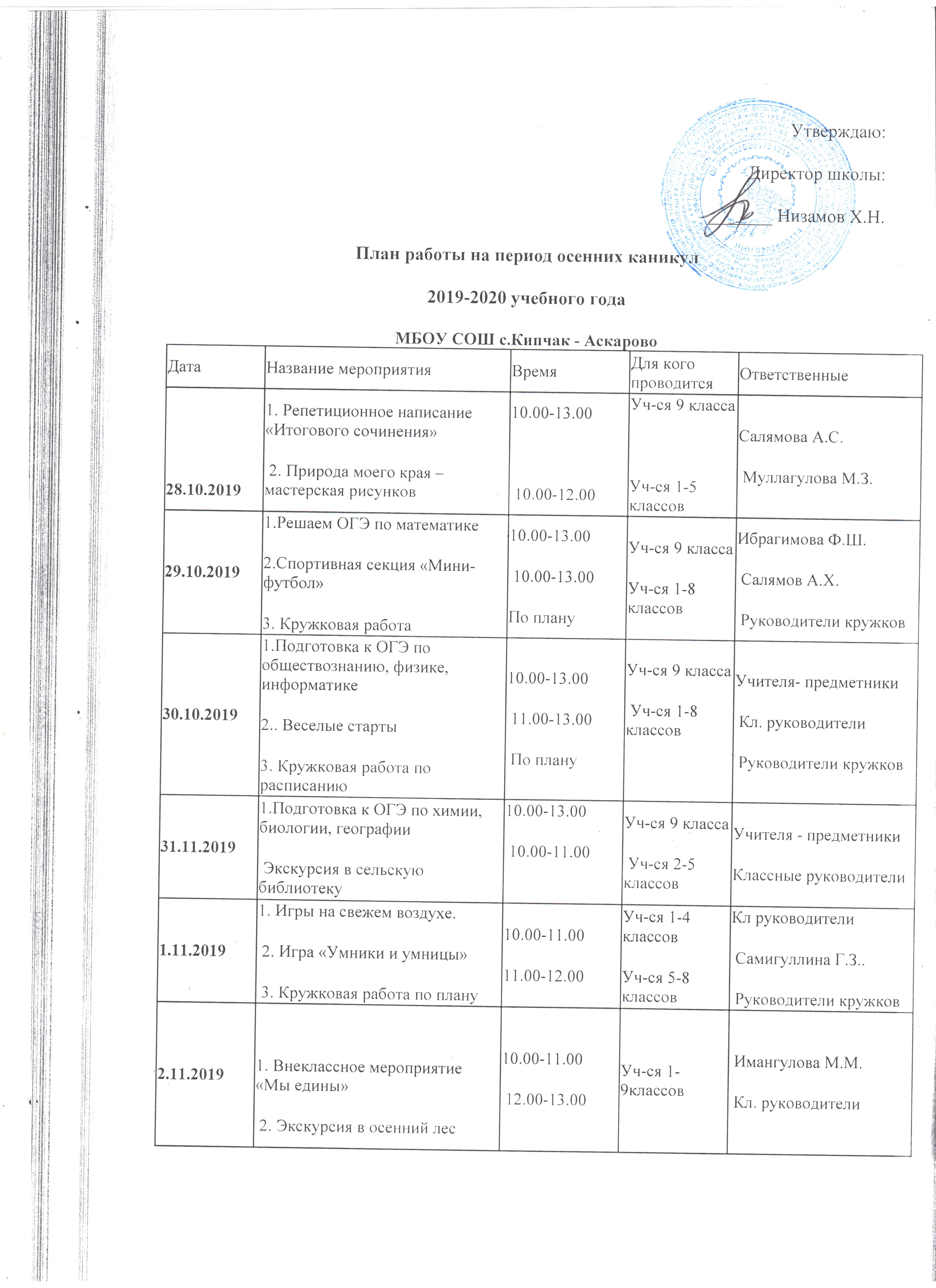 План мероприятий на зимние каникулы в МБОУ СОШ с.Кипчак-Аскарово 2026 уч год